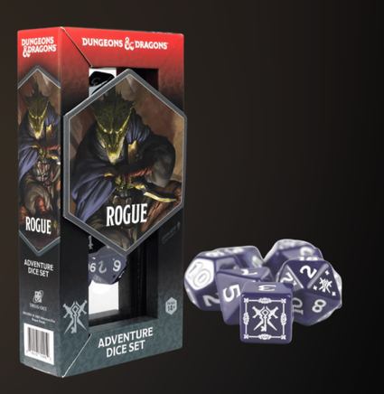 Step into the shadows with the officially licensed Dungeons & Dragons Adventure Dice Set for Rogues with these stealthy purple dice. This set is designed to embody the cunning and finesse of the Rogue, with dice tailored for executing deadly sneak attacks and evading traps. Whether you’re slipping through the shadows or outwitting your foes, these dice will enhance your Rogue’s every move.