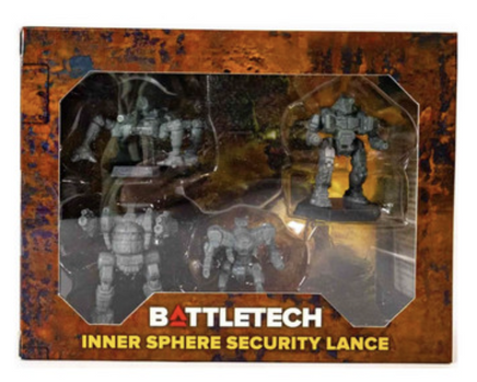 The Inner Sphere Security Lance is a collection of four plastic miniatures for use in the classic BattleTech tabletop and Alpha Strike games. The box also provides four dry-erase cards, which are intended to directly support Alpha Strike gameplay, and four new Pilot Cards.
