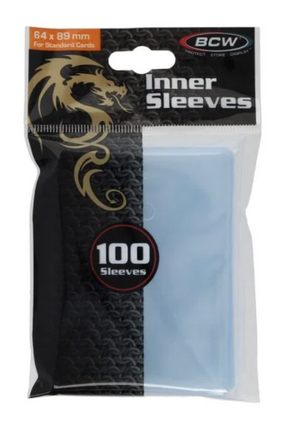 Clear 64mm x 89mm inner sleeves for double sleeving standard sized trading game cards. 100 count pack.