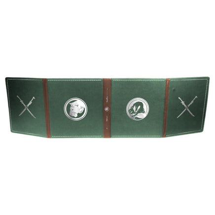 This officially licensed screen features a Sage Green and Brown pebbled leatherette exterior and soft light grey suede interior featuring an original map by Deven Rue of the Forgotten Realms with silver metal and foil accents, and sits perfectly flush on the shelf next to your other Ultra PRO Premium Source Book Covers.
